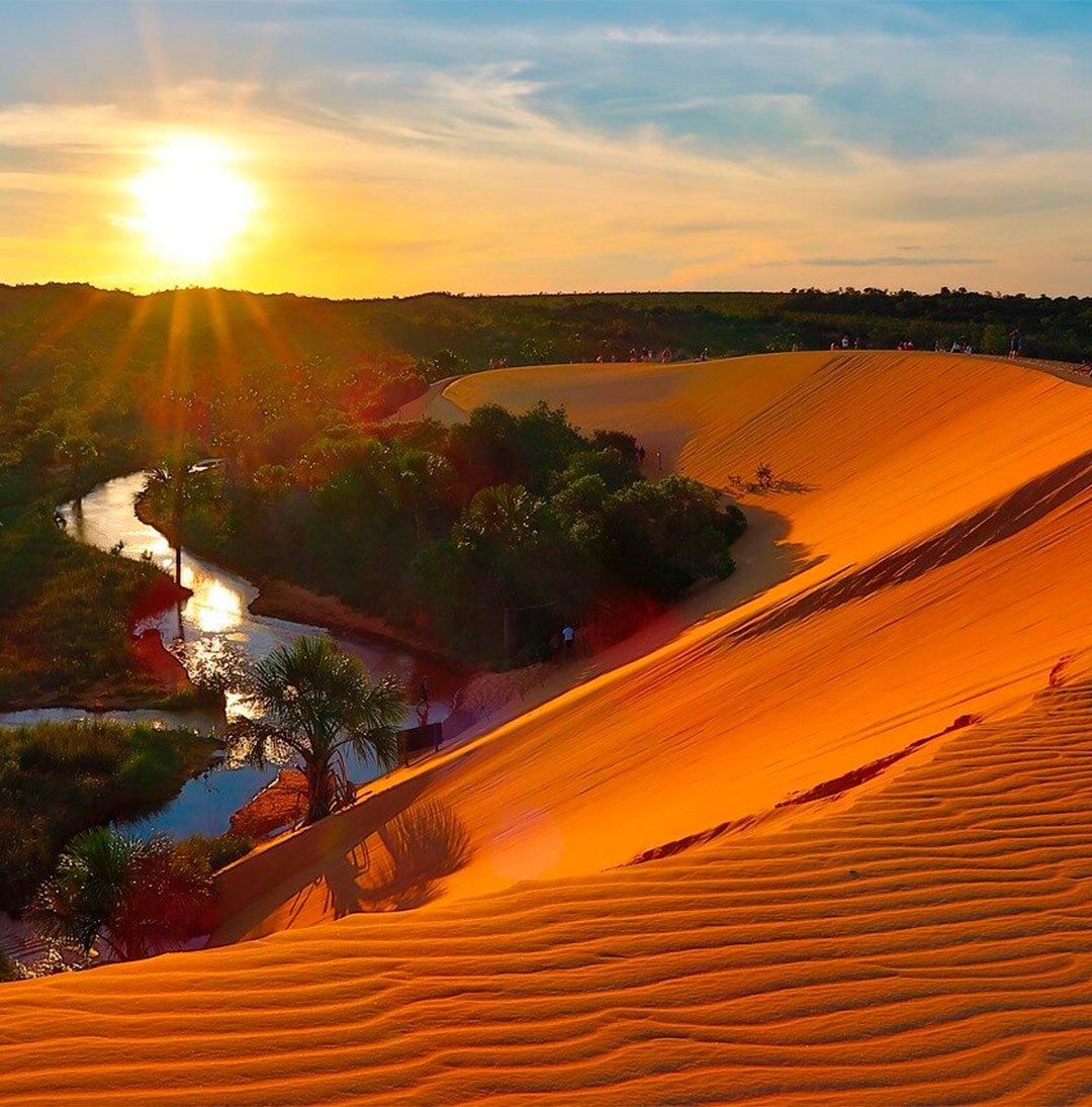 As dunas são um espetáculo natural cuja altitude varia de 200 a 400 metros, de onde se descortina a bela paisagem de areias que refletem a luz solar em variados tons de dourado mesclado com o azul dos rios e, aqui e acolá, do verde da vegetação rasteira típica da região e dos buritizais que vicejam à beira de nascentes. As dunas são um espetáculo natural.